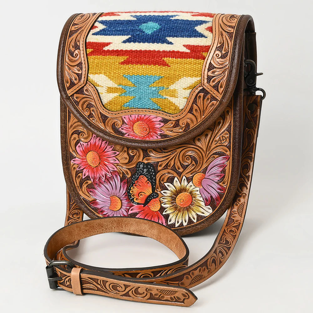The shoulder strap is adjustable and made of 100% genuine vegetable tanned Cowhide Leather with a hand tooled pattern.