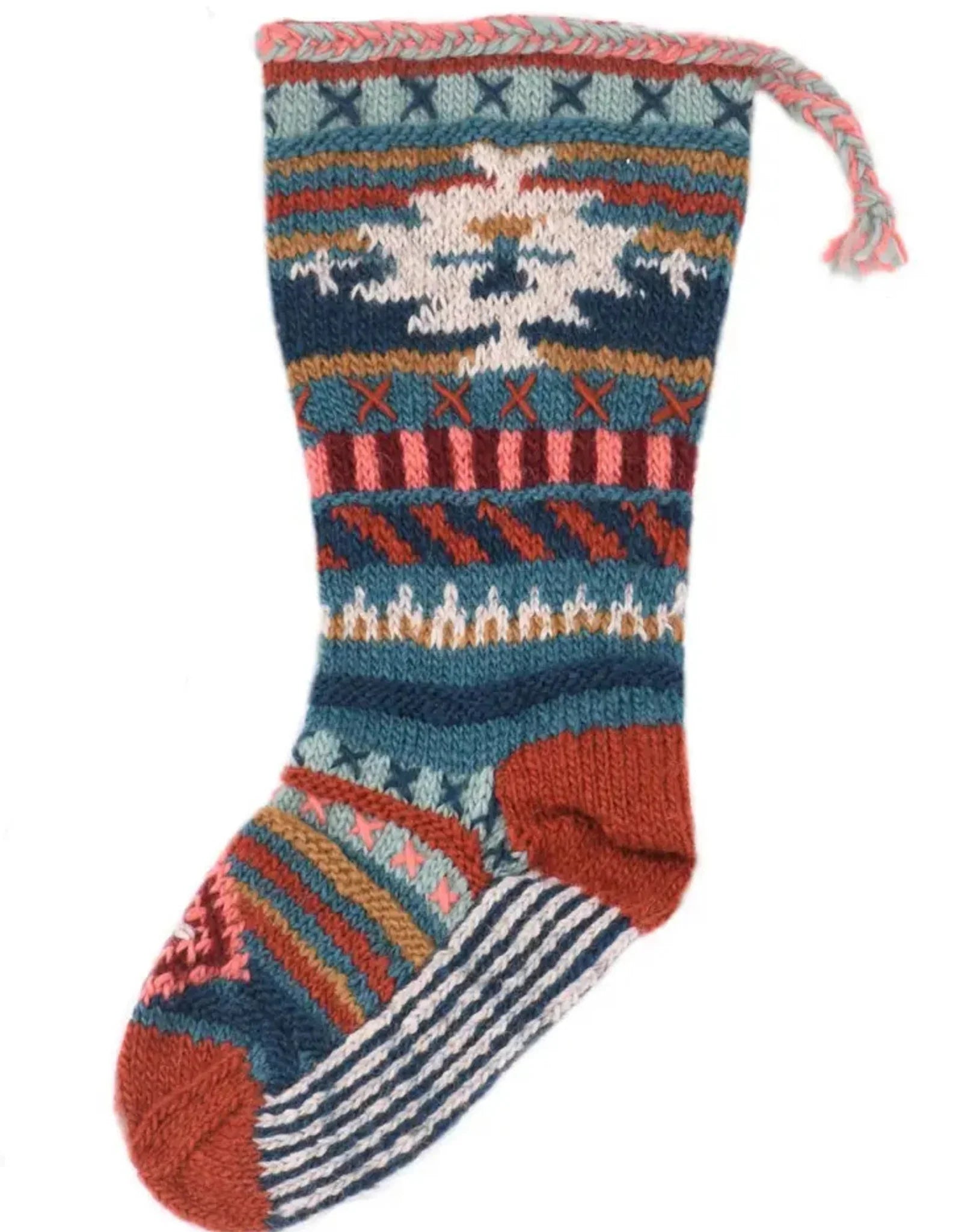 Galisteo Christmas Stocking with colorful knitted patterns and a hanging loop for holiday décor