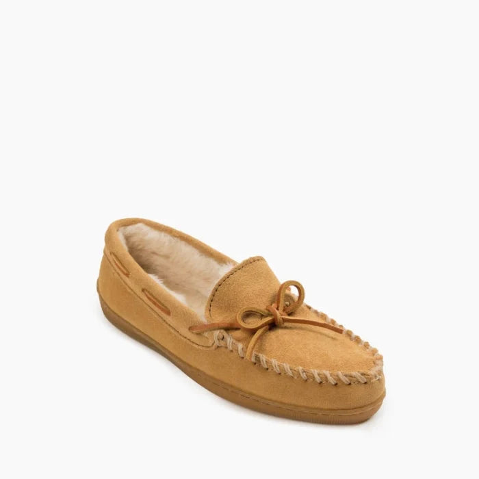 Minnetonka PILE LINED HARDSOLE moccasins with genuine suede, soft pile lining, and durable rubber sole for comfort and style.
