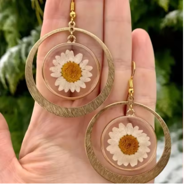 Elevate your style with these stunning Natural White Daisy Pressed Earrings. Featuring a delicate daisy flower pressed inside clear resin, each earring is a work of nature-inspired art. The unique design combines the beauty of nature with modern craftsmanship, offering a boho chic look that’s perfect for any occasion.