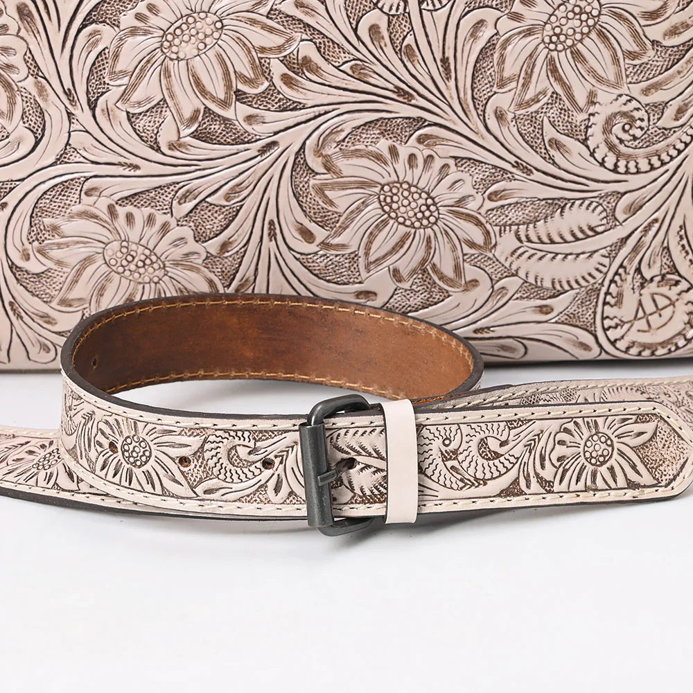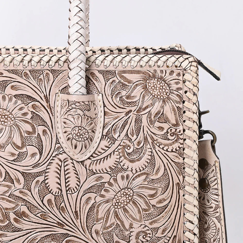 Detailed Hand tooled, carved and finally antique hand finished vegetable tanned American Cowhide Leather, exquisitely done by the finest artists and craftsmen in the country.High quality Genuine Full Grain Leather. Soft and supple leather that ages beautifully as it wears. The shoulder strap is adjustable and made of 100% genuine vegetable tanned Cowhide Leather with a hand tooled pattern. Highly durable solid Antique finish metal fittings. Genuine YKK brand known for long lasting and durable zipper closures ensure security of your essentials. Beautiful, detailed Leather Braiding. Size/Dimensions: 10in (H) X 14in (W) X 4.5in (D)A luxurious and western handcrafted leather collection designed by American Darling here in the heart of Texas. These gorgeous creations deliver a blend of western culture and heritage along with the latest fashion and trendy appeal. It makes your appearance eye-catching by its amazing colors, materials, and meticulous hand work. Eco friendly genuine leather is handpicked and sourced from some of the best tanneries in the world. The bag is made by highly experienced and skilled craftsmen of the industry using the highest quality standard of production.