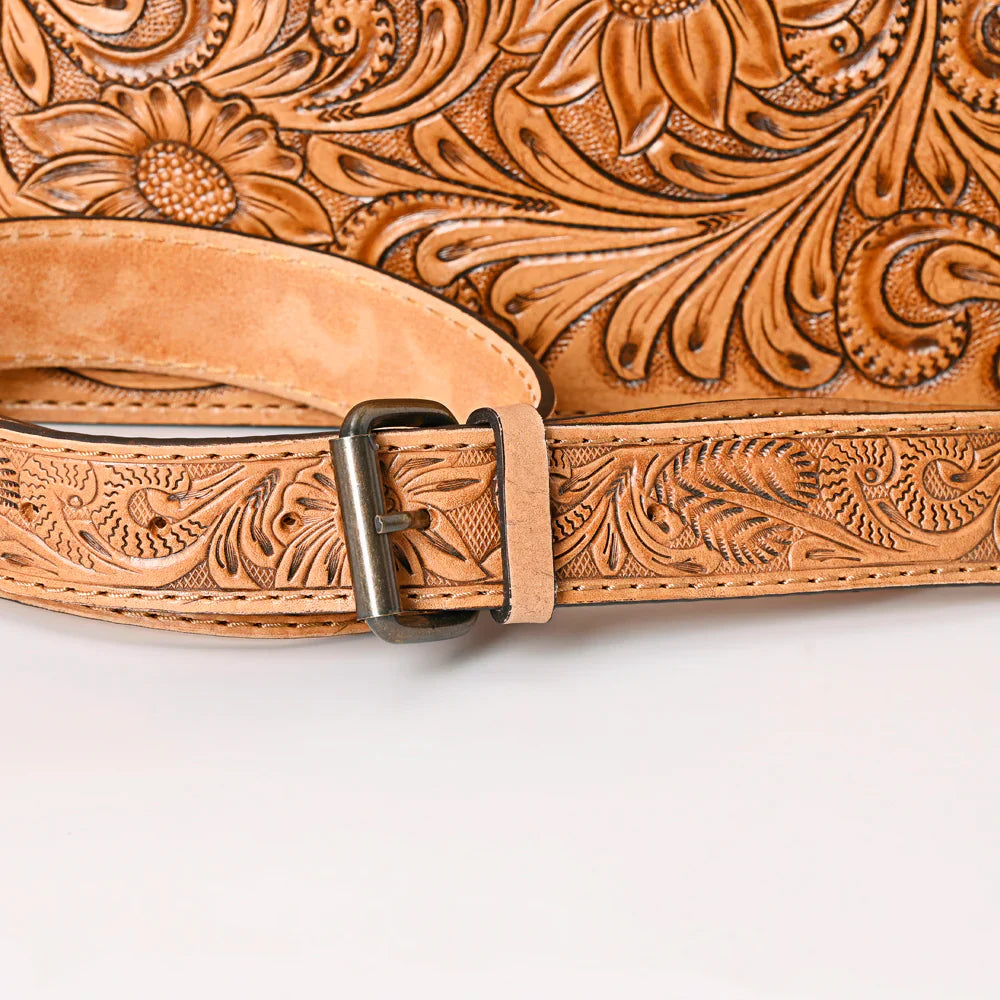 The shoulder strap is adjustable and made of 100% genuine vegetable tanned Cowhide Leather with a hand tooled pattern.