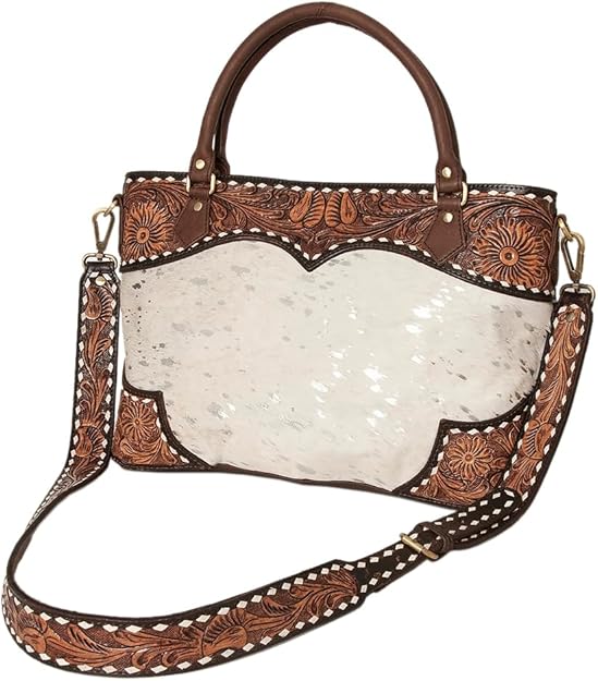 American Darling Tote with hand-tooled floral leather, white whipstitch trim, detachable shoulder strap, and secure zipper closure