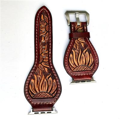 Detailed Hand tooled, carved and painted vegetable tanned American Cowhide Leather exquisitely done by the finest craftsmen in the country. High quality Genuine Full Grain Leather. Soft and supple leather that ages beautifully as it wears. High grade Stainless Steel Metal fitting. Size 41 - Fits watch strap between 38mm to 41mm.Size 45 - Fits watch strap between 42mm to 45mm.