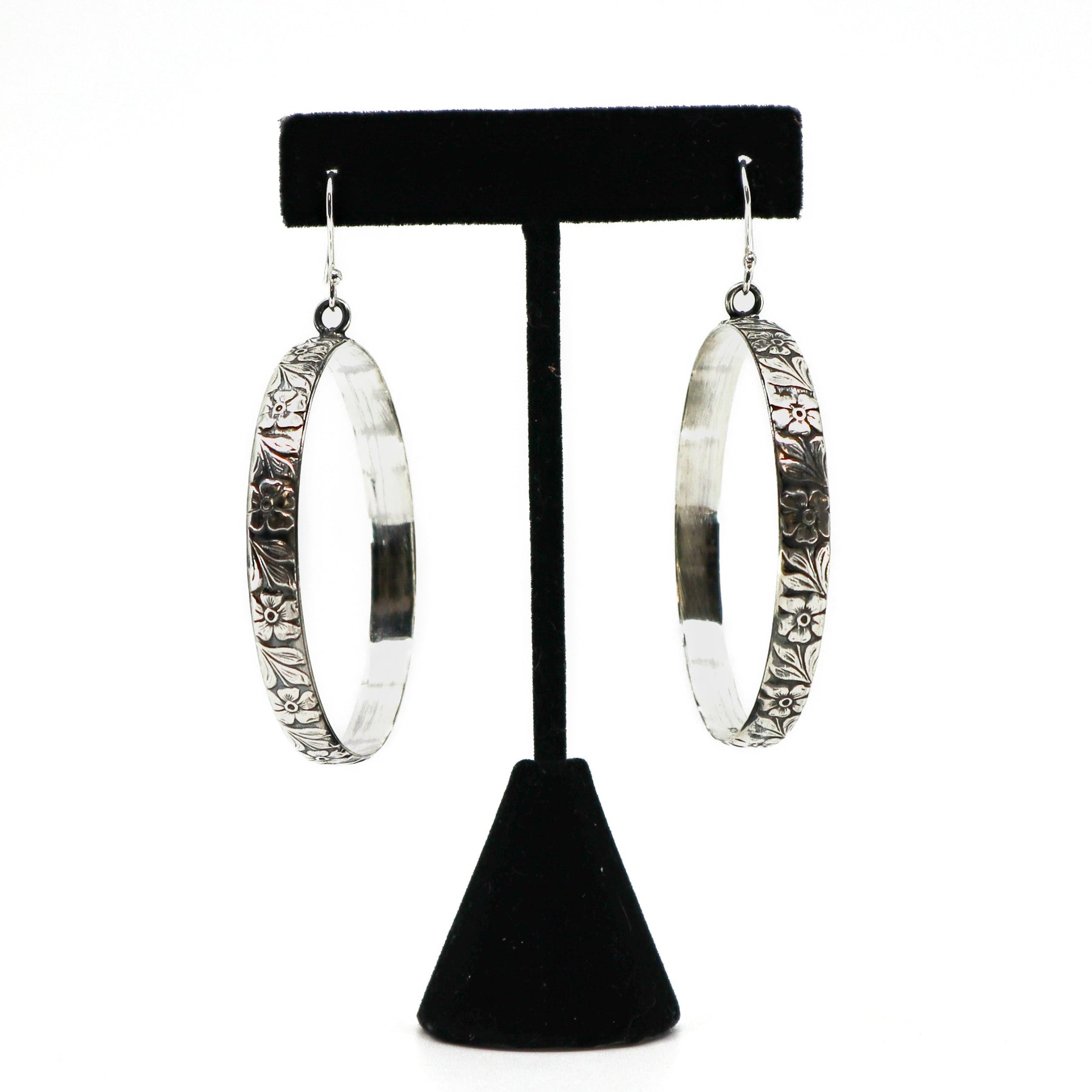 Handmade sterling silver floral engraved hoop earrings on black stand