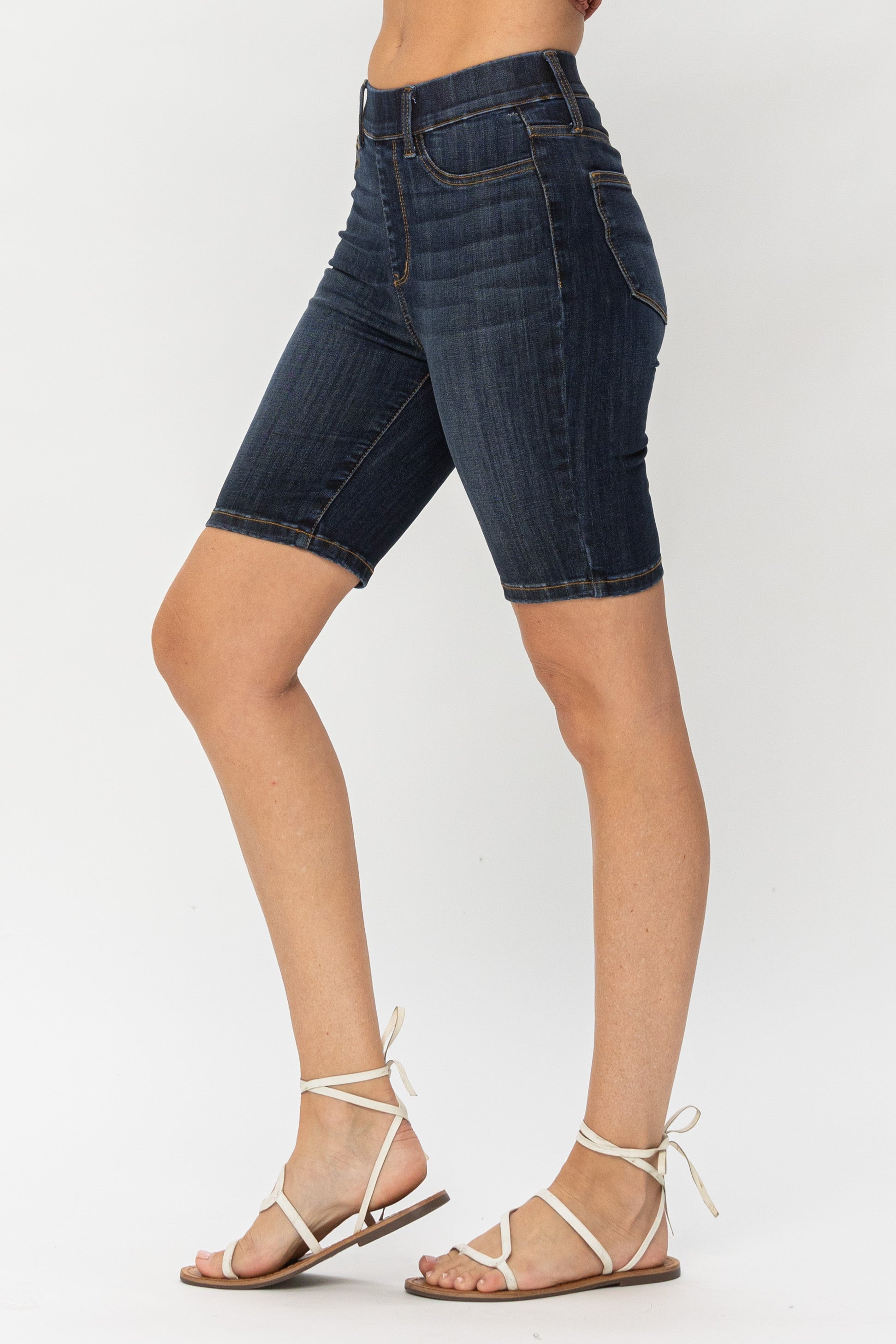 HIGH WAISTED DARK WASH PULL ON BIKER SHORTS