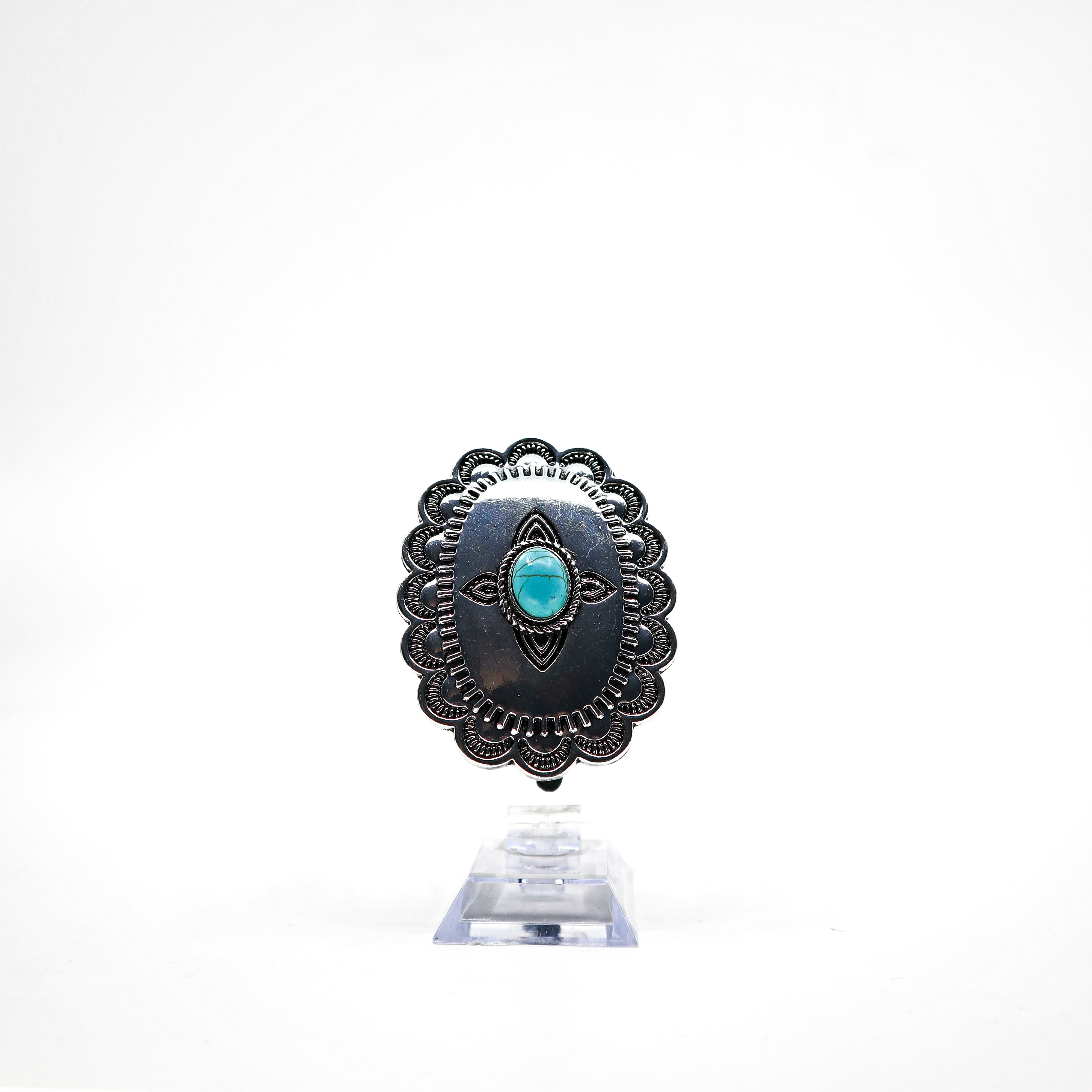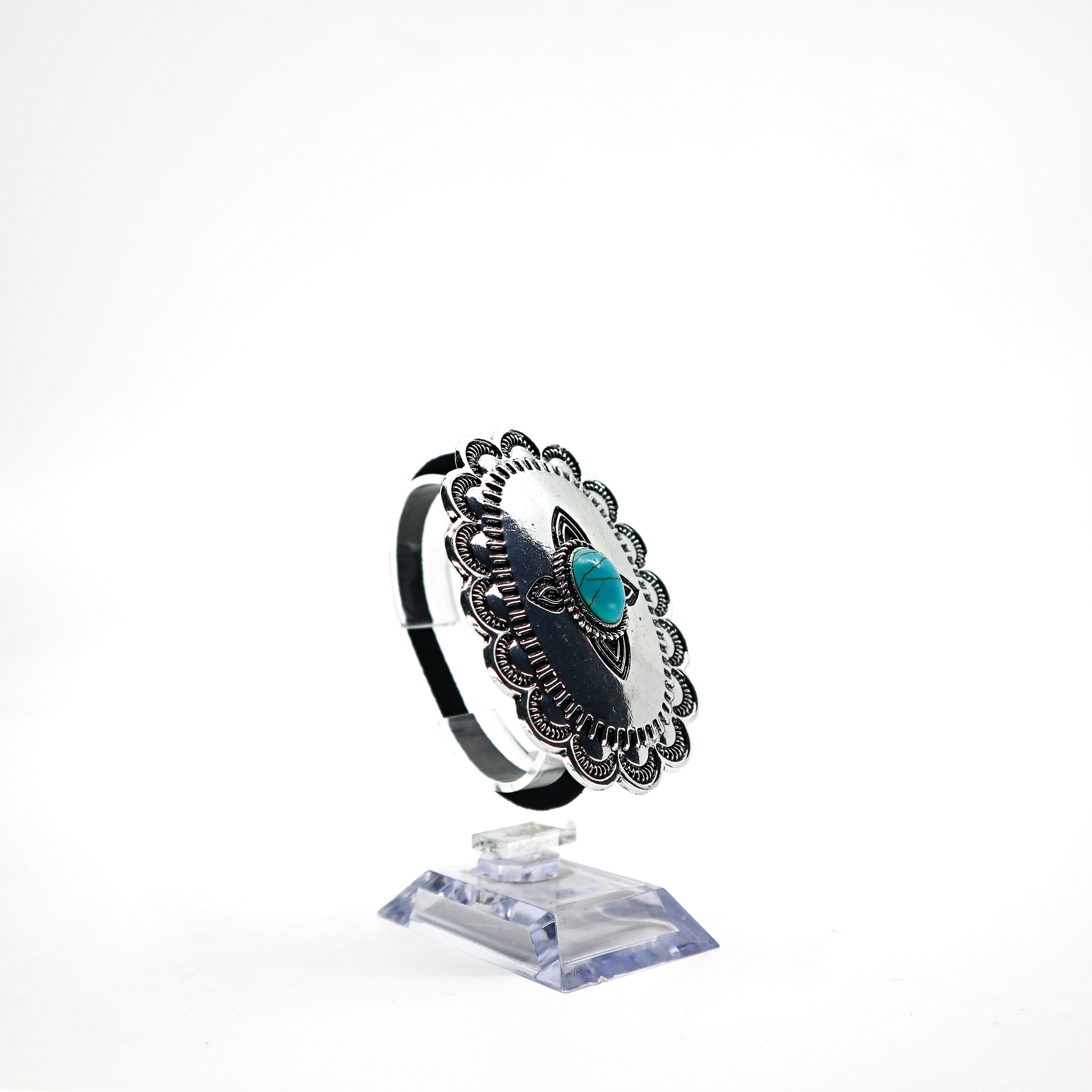 Turquoise Concho ponytail holder with intricate silver detailing PSTPHC07 displayed on clear stand