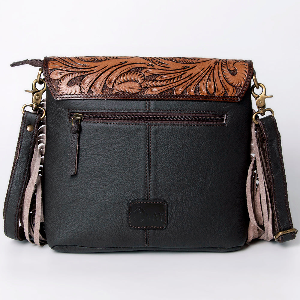 Hand Tooled Saddle Leather and Upcycled Canvas Ladies Bag 11.5x12