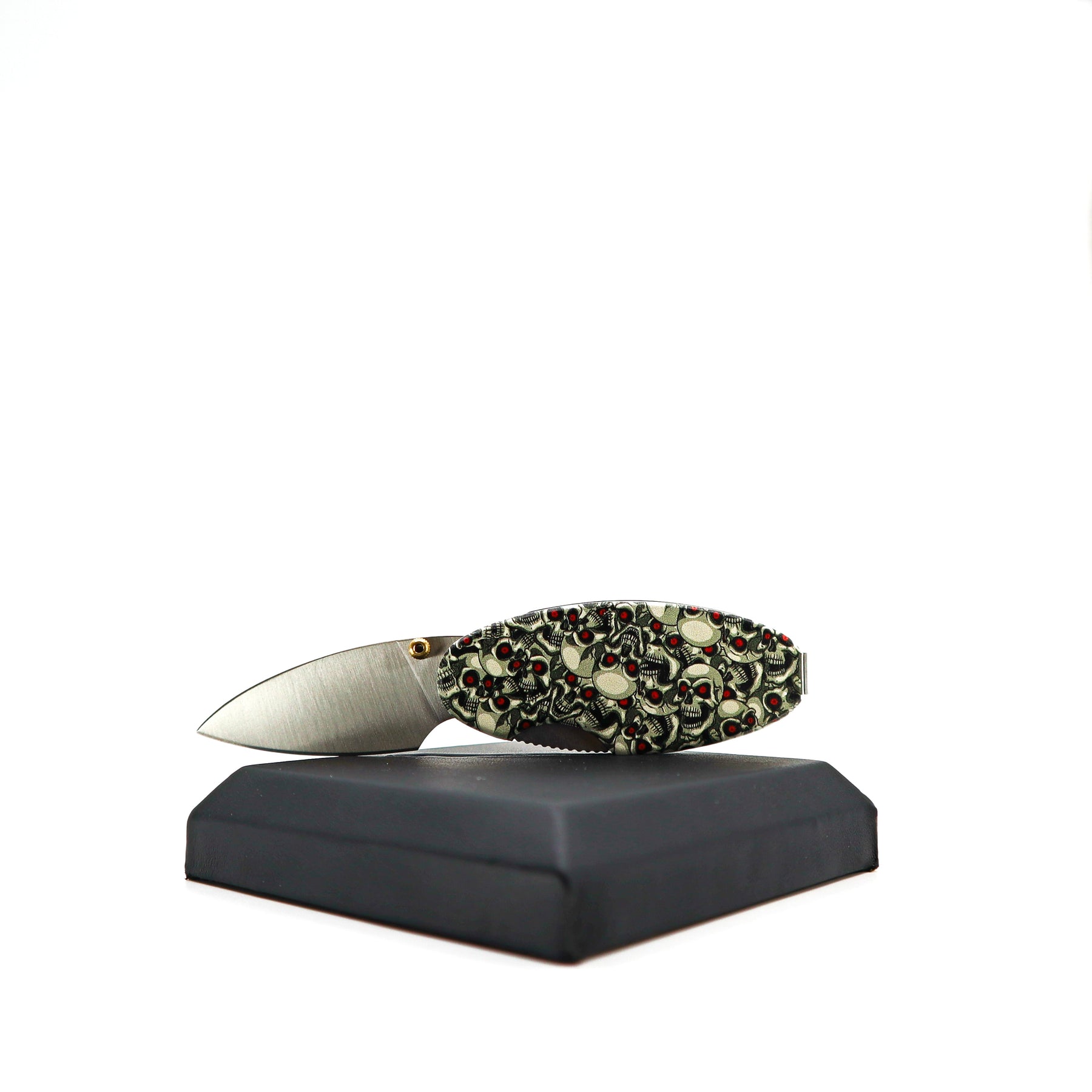 The assortment includes bold handle designs, Ghost Skull, Classic Camo, Patriotic Eagle, Dollar Bill, Red-Eyed Skulls, and American Flag, four of each, offering variety for collectors, gift buyers, or resellers.