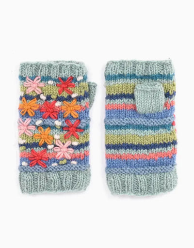 Skylar Handwarmers striped knit fingerless gloves with floral embroidery in pastel colors
