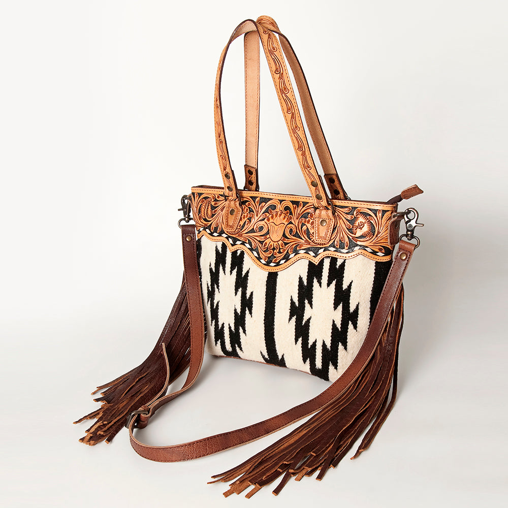The shoulder strap is adjustable and made of 100% genuine vegetable tanned Cowhide Leather with a hand tooled pattern.