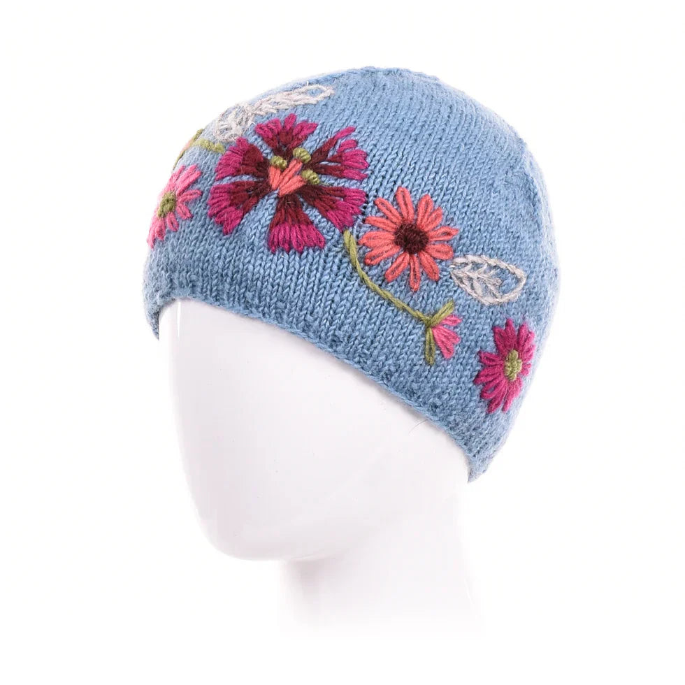 Light blue Stella Wool Beanie with hand-embroidered pink and red floral designs on soft knitted wool.