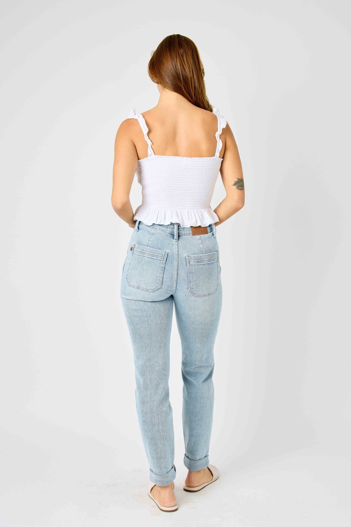 Woman wearing high waist vintage double-cuffed Judy Blue Jeans 88691 and white top
