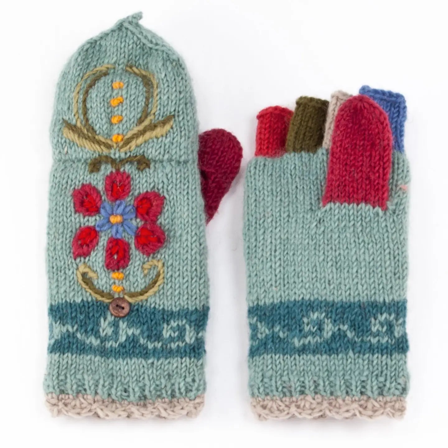 Fully fleece-lined for maximum warmth, the mittens include a fold-over flap that converts them from fingerless to full coverage, secured neatly with a button. The mix of four different wool shades in the half-finger design adds a playful, colorful twist.