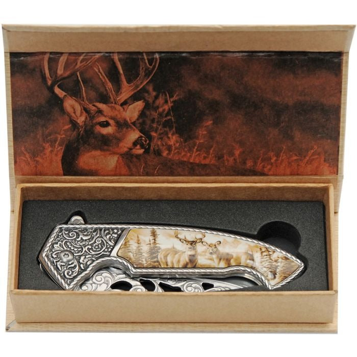 Framelock knife with satin finish 420 stainless steel blade and detailed wildlife handle in gift box