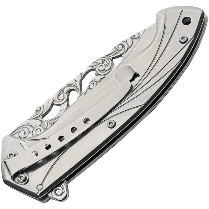 Framelock knife with satin finish 420 stainless steel blade and detailed stainless steel handle with wolf design
